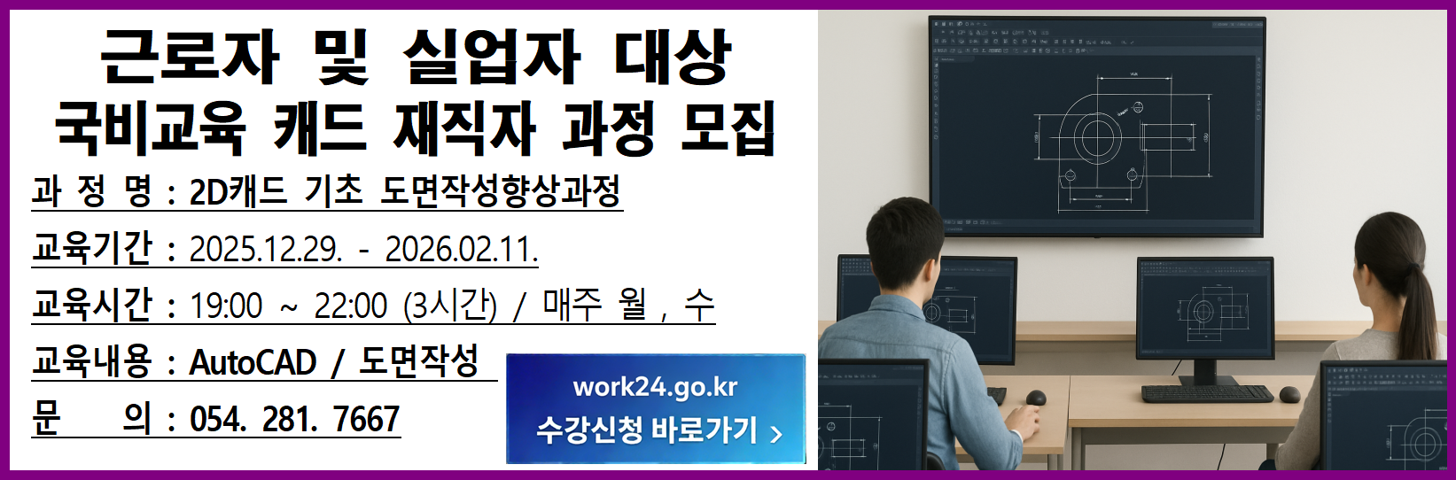 과 정 명:2D캐드 기초 도면작성향상과정교육기간:2025.12.29. - 2026.02.11교육시간:19:00 ~ 22:00 (3시간) /매주 월,,수교육내용: AutoCAD /도… 더보기
