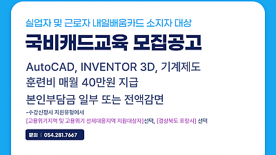 과 정 명:2D캐드 기초 도면작성향상과정교육기간:2025.12.29. - 2026.02.11교육시간:19:00 ~ 22:00 (3시간) /매주 월,,수교육내용: AutoCAD /도… 더보기